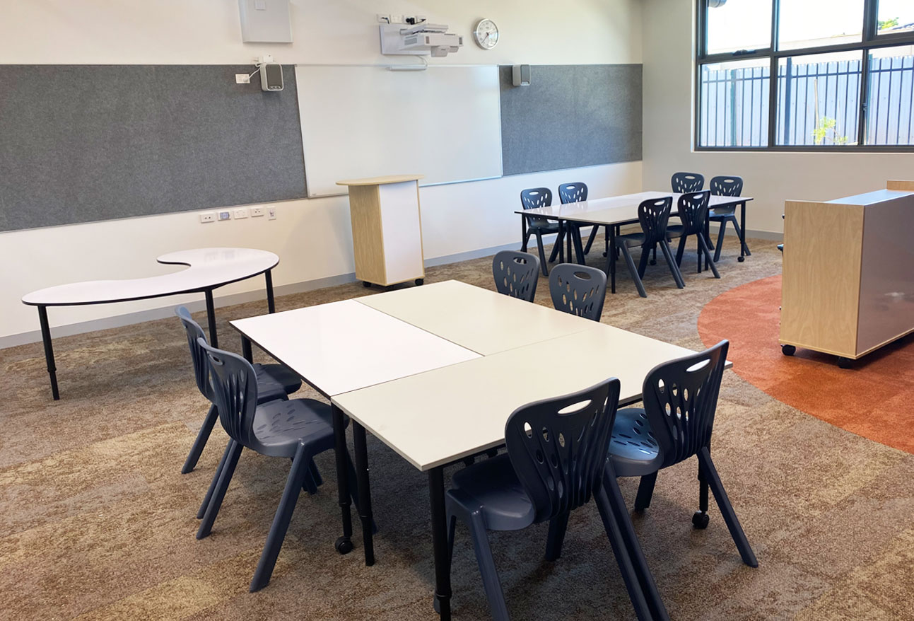 Melton Specialist School in Victoria provides an inclusive and developmental curriculum that challenges students to extend their skills and knowledge in a caring and supportive environment. BFX were proud to fit-out the schools new building that is home to classrooms, specialist art and science rooms, a staffroom and admin offices. The building also boasts a living and dining room where older students can learn healthy eating habits and life skills. All spaces needed to cater for a wide range of abilities and age groups therefore, adjustable height, agile furniture was key. Indigenous themes were chosen to acknowledge the lands and people of the area, whilst connecting to the overall colour palette and functionality of spaces.