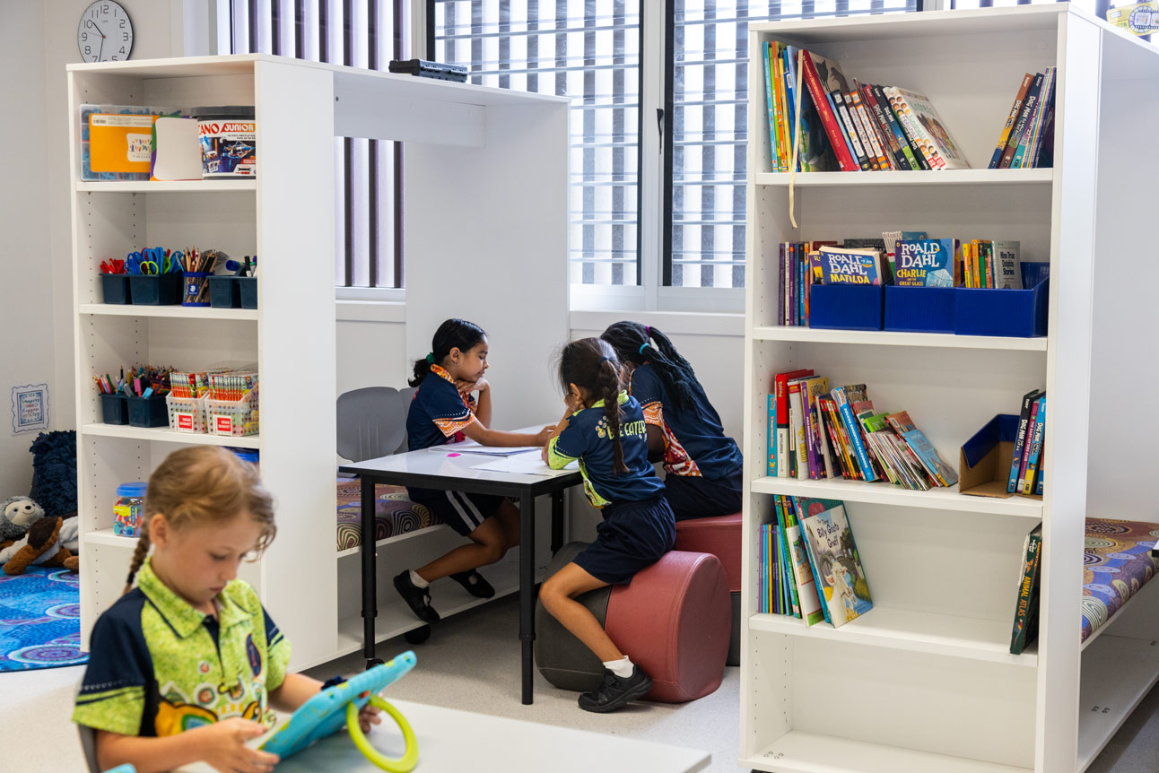 Colour played an important role in the project. A standard chair and desk colour was chosen for all classrooms as part of future planning, so that furniture could be moved around the school easily. Colour and personality were bought into the classrooms using soft furnishings through a mix of specialty BFX Indigenous fabrics, plain fabrics and vinyls that complemented the buildings accent colours. This colour theory was extended to the Curiosity Centre and Admin areas.