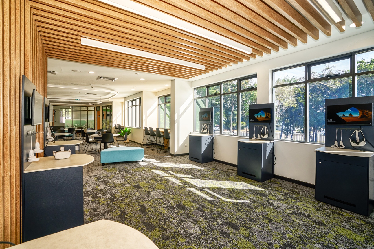 Spaces with flexible, comfortable furniture signal that student wellbeing and learning autonomy matter. Options like ottomans and height-adjustable desks on castors create an adaptive, student-centred environment. A great example is Ripley Central State School.