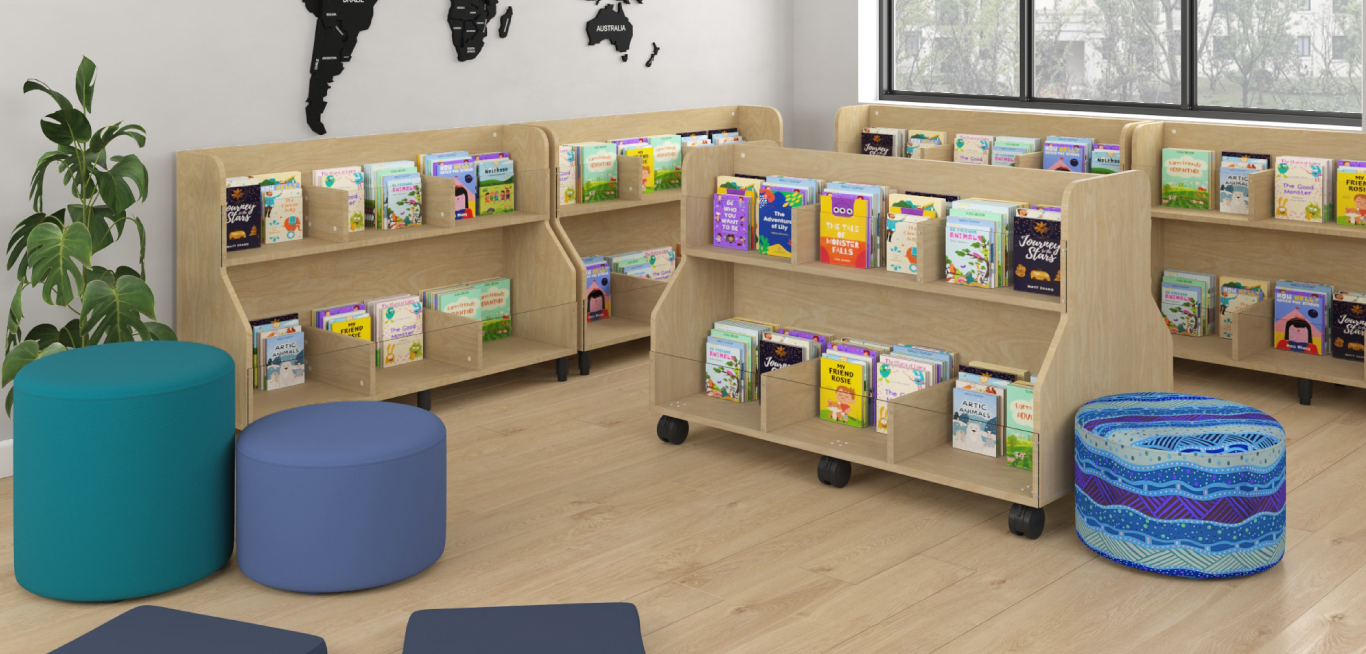 Book Nook Double Display Unit is designed to create visible, accessible book display zones in junior learning spaces, libraries, breakout areas and learning commons. Its double-sided layout allows students to browse from all sides, making it ideal for central placement that supports shared access, student autonomy and independent exploration. Front-facing shelves clearly display book covers, helping students select reading materials with confidence. Each compartment holds approximately 15 cover-facing books on the top shelf and around 25 on the base shelf, maintaining visibility while optimising storage. Clear perspex secures books while allowing students to flip through titles independently. Premade boards are available in a mobile configuration for prompt delivery, while custom board finishes are offered in a choice of mobile or static feet options to suit space requirements. This Display Unit delivers durable performance for literacy-rich, student-centred learning spaces.