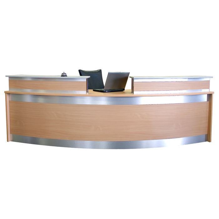 The Volare Reception Desk is a large curved counter with a modern design, including a mirror strip laminate kick plate, and additional mirror strip detail features.