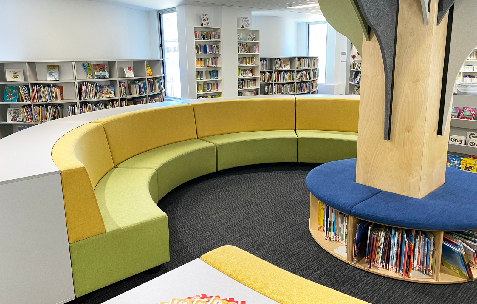 Furniture Tip: Our Beachcomber fabrics in Fern and Kiwi are ideal for library seating like the Cirkus Mobile Lounge or Dino Diplo Den Reading Chair.